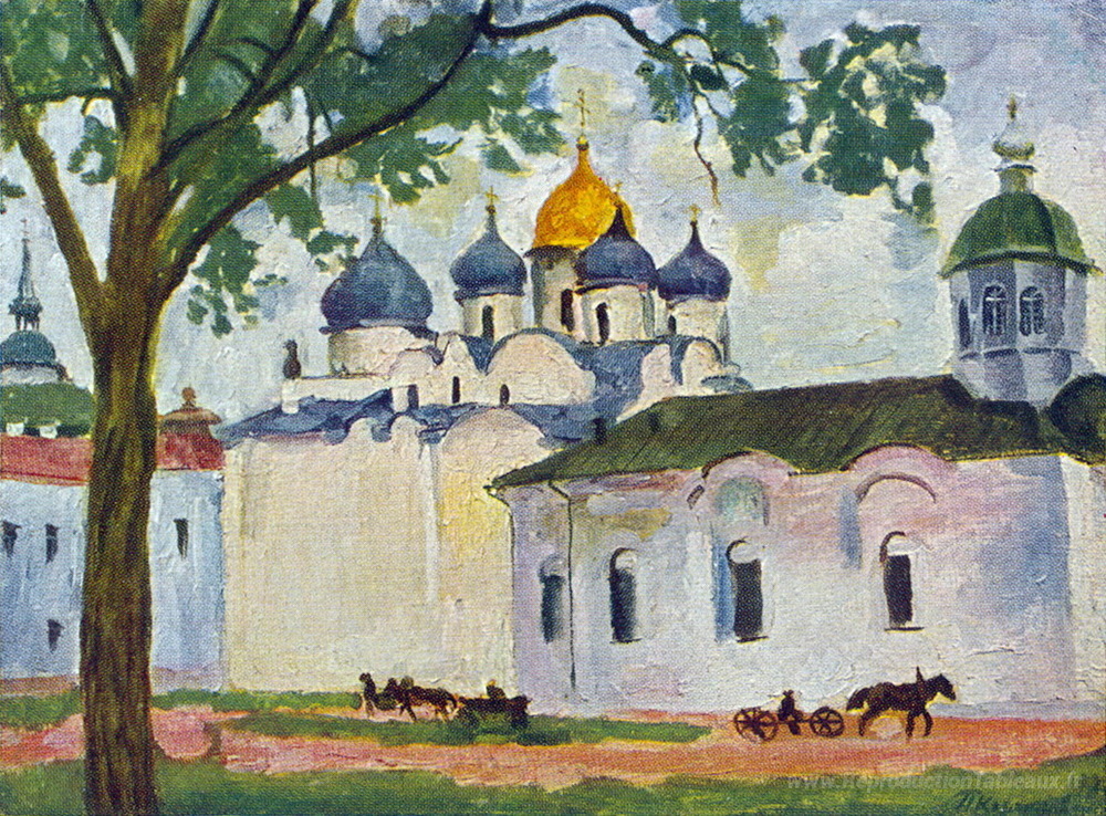 Nous vous proposons une reproduction artisanale sur toile du célèbre tableau 'Novgorod. Square de la cathédrale St. Sophia.' de Pyotr Konchalovsky, provenant du Musée de la Reproduction.