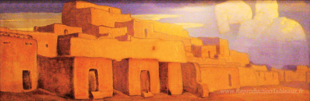 Nous vous proposons une reproduction artisanale sur toile du célèbre tableau 'Nuage prévu' de Nicholas Roerich, provenant du Musée de la Reproduction.