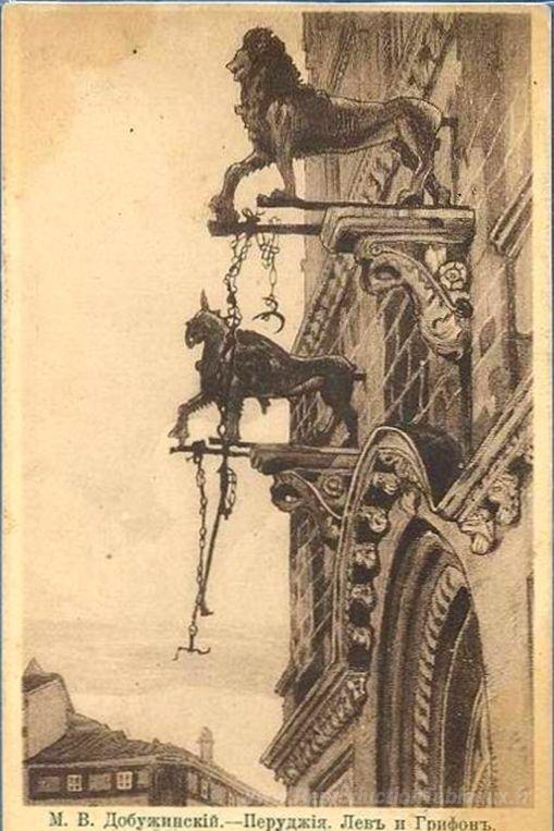 Nous vous proposons une reproduction artisanale sur toile du célèbre tableau 'Pérouse. Lion et Gryphon.' de Mstislav Dobuzhinsky, provenant du Musée de la Reproduction.