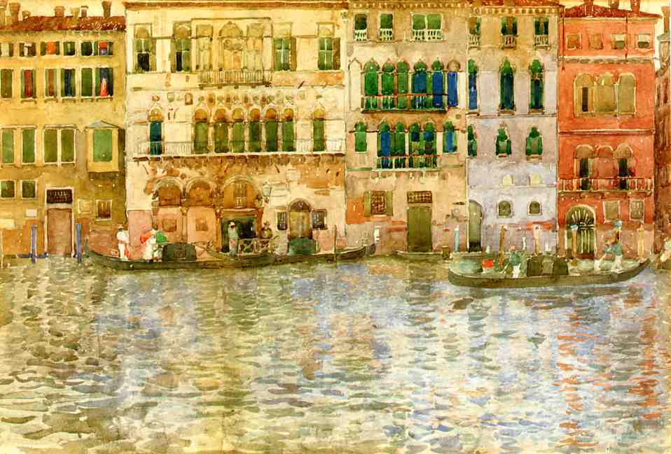 Nous vous proposons une reproduction artisanale sur toile du célèbre tableau 'Palais vénitiens sur le Grand Canal' de Maurice Prendergast, provenant du Musée de la Reproduction.