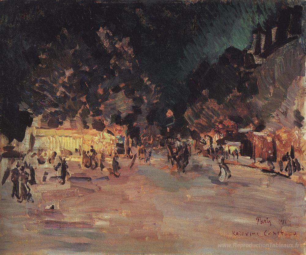 Nous vous proposons une reproduction artisanale sur toile du célèbre tableau 'Paris la nuit' de Konstantin Korovin, provenant du Musée de la Reproduction.