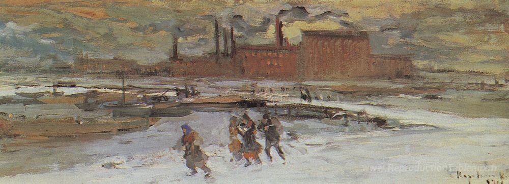 Nous vous proposons une reproduction artisanale sur toile du célèbre tableau 'Paysage avec bâtiments d'usine' de Konstantin Korovin, provenant du Musée de la Reproduction.