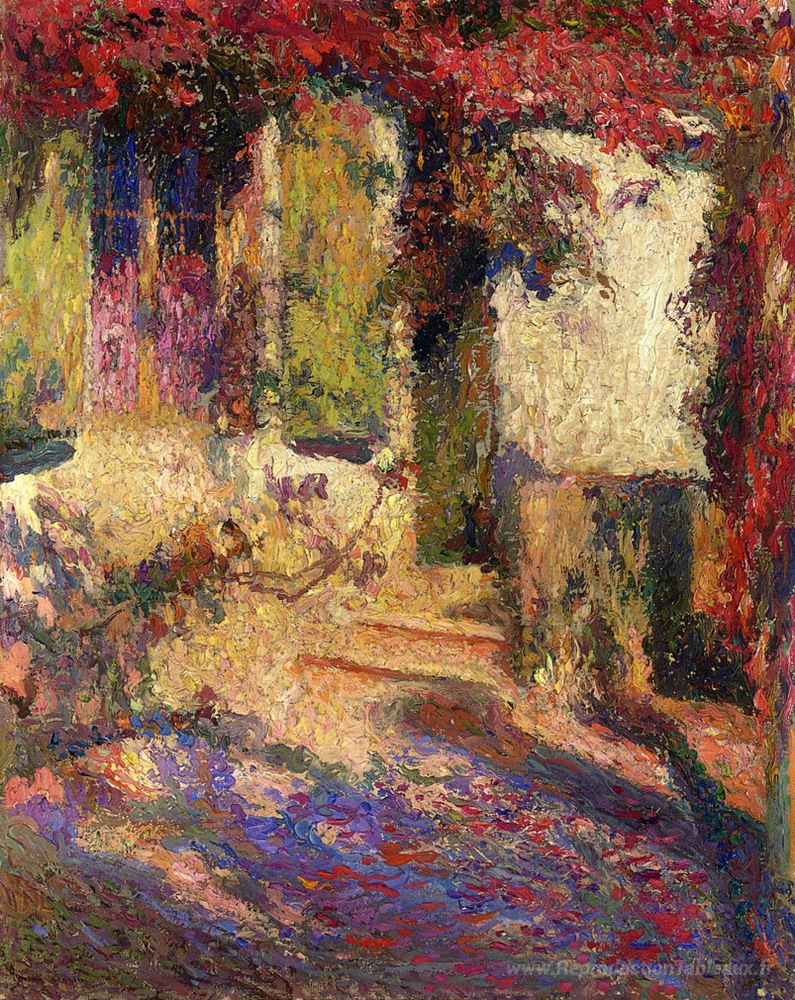 Nous vous proposons une reproduction artisanale sur toile du célèbre tableau 'Pergola à la porte sud de Marquayrol' de Henri Martin, provenant du Musée de la Reproduction.