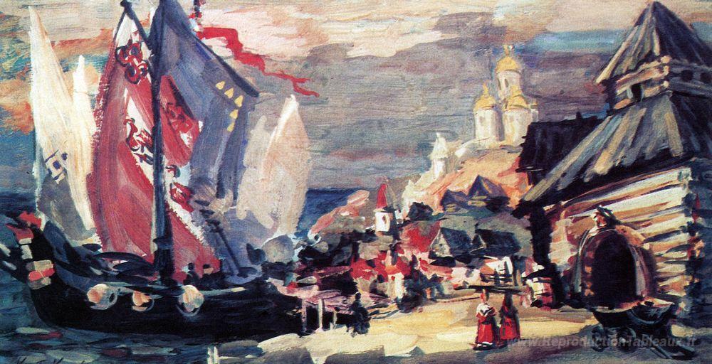 Nous vous proposons une reproduction artisanale sur toile du célèbre tableau 'Pier à Novgorod' de Konstantin Korovin, provenant du Musée de la Reproduction.