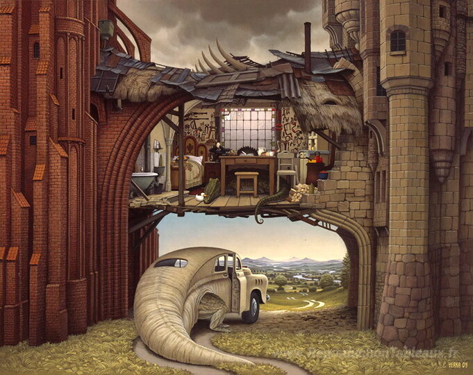 Nous vous proposons une reproduction artisanale sur toile du célèbre tableau 'Pierre et brique' de Jacek Yerka, provenant du Musée de la Reproduction.