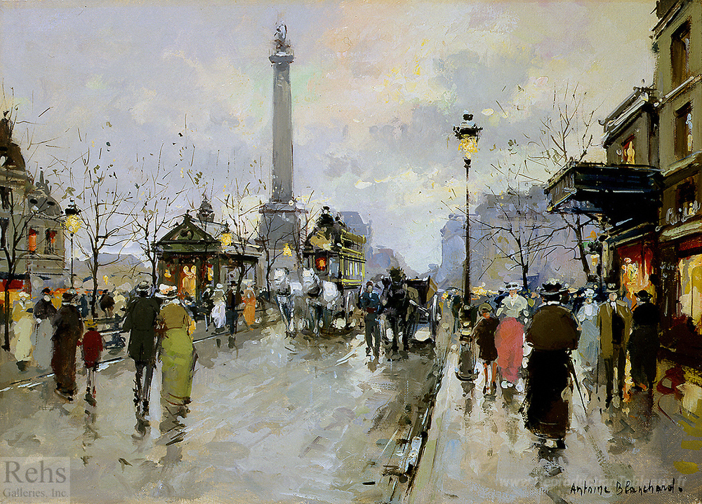 Nous vous proposons une reproduction artisanale sur toile du célèbre tableau 'Place de la Bastiile' de Antoine Blanchard, provenant du Musée de la Reproduction.