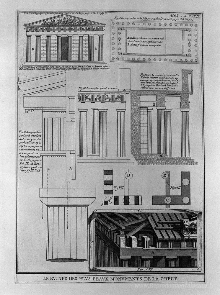 Nous vous proposons une reproduction artisanale sur toile du célèbre tableau 'Plan, élévation et détails des temples doriques en Grèce (du Roy' de Giovanni Battista Piranesi, provenant du Musée de la Reproduction.