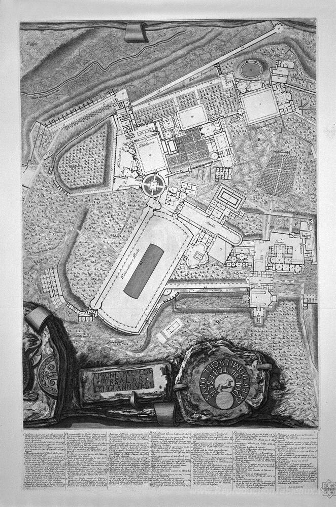 Nous vous proposons une reproduction artisanale sur toile du célèbre tableau 'Plan des usines existantes dans la villa Adriana, avec un dévoue' de Giovanni Battista Piranesi, provenant du Musée de la Reproduction.