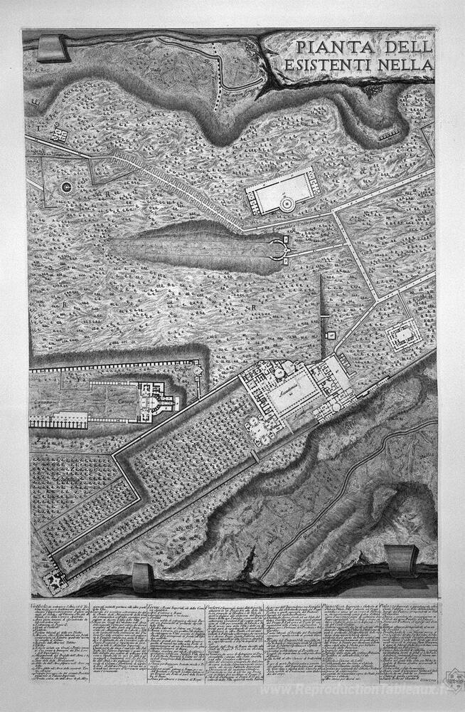 Nous vous proposons une reproduction artisanale sur toile du célèbre tableau 'Plan des usines existantes dans la villa Adriana, avec un dévoue' de Giovanni Battista Piranesi, provenant du Musée de la Reproduction.