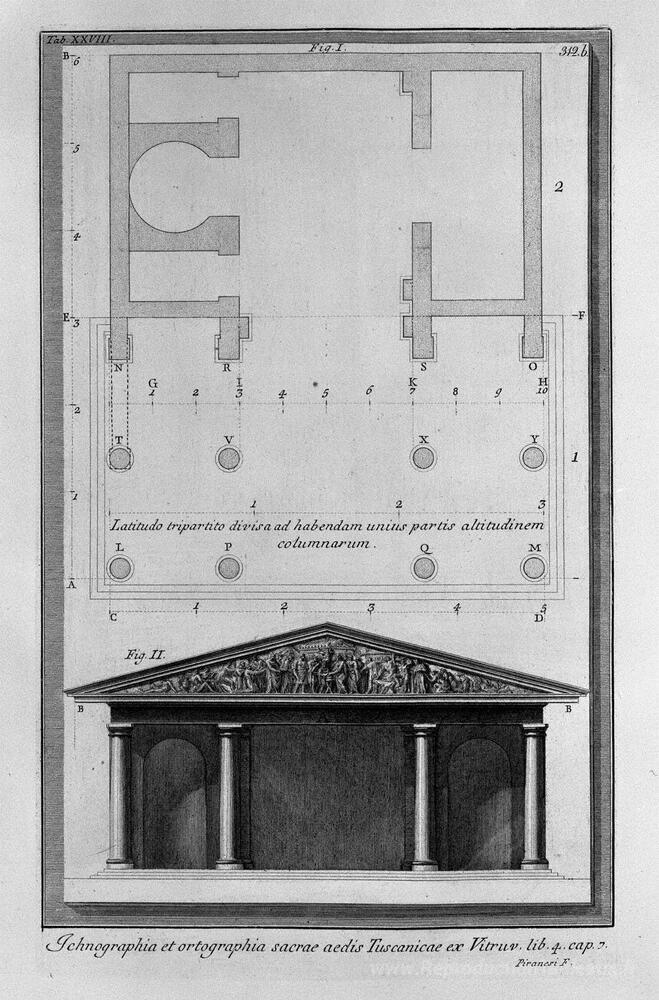 Nous vous proposons une reproduction artisanale sur toile du célèbre tableau 'Plan et élévation du deuxième temple toscan vitruvuus' de Giovanni Battista Piranesi, provenant du Musée de la Reproduction.