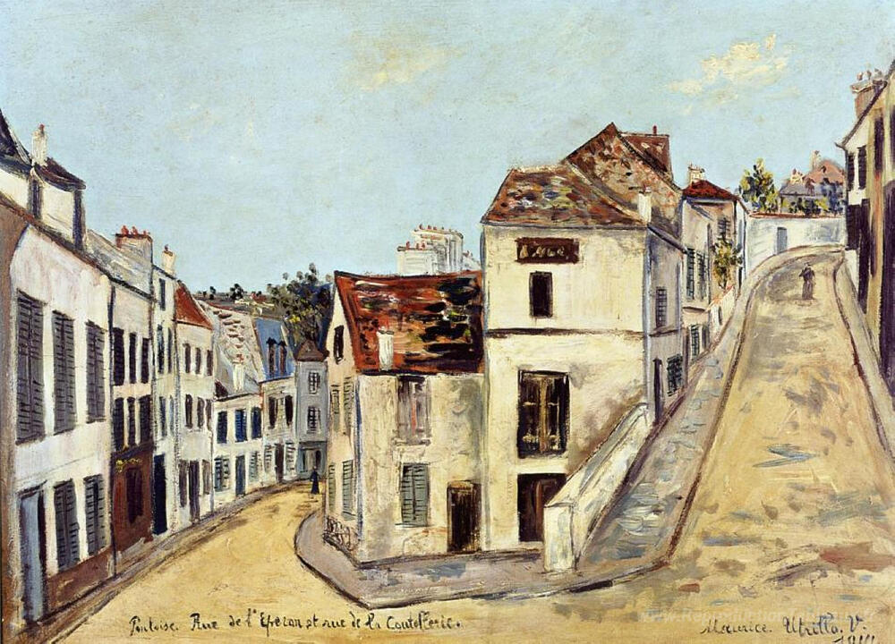 Nous vous proposons une reproduction artisanale sur toile du célèbre tableau 'Pontoise, l'Eperon Street et Street de la Couttellerie' de Maurice Utrillo, provenant du Musée de la Reproduction.