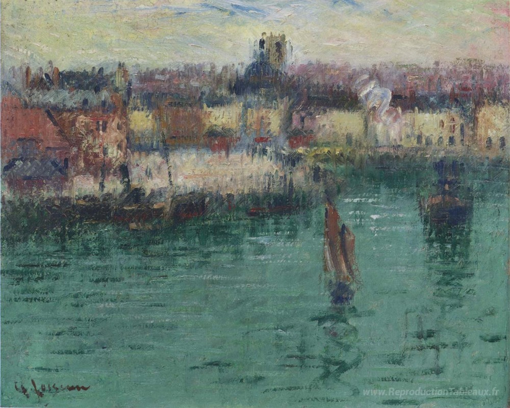 Nous vous proposons une reproduction artisanale sur toile du célèbre tableau 'Port à Dieppe' de Gustave Loiseau, provenant du Musée de la Reproduction.