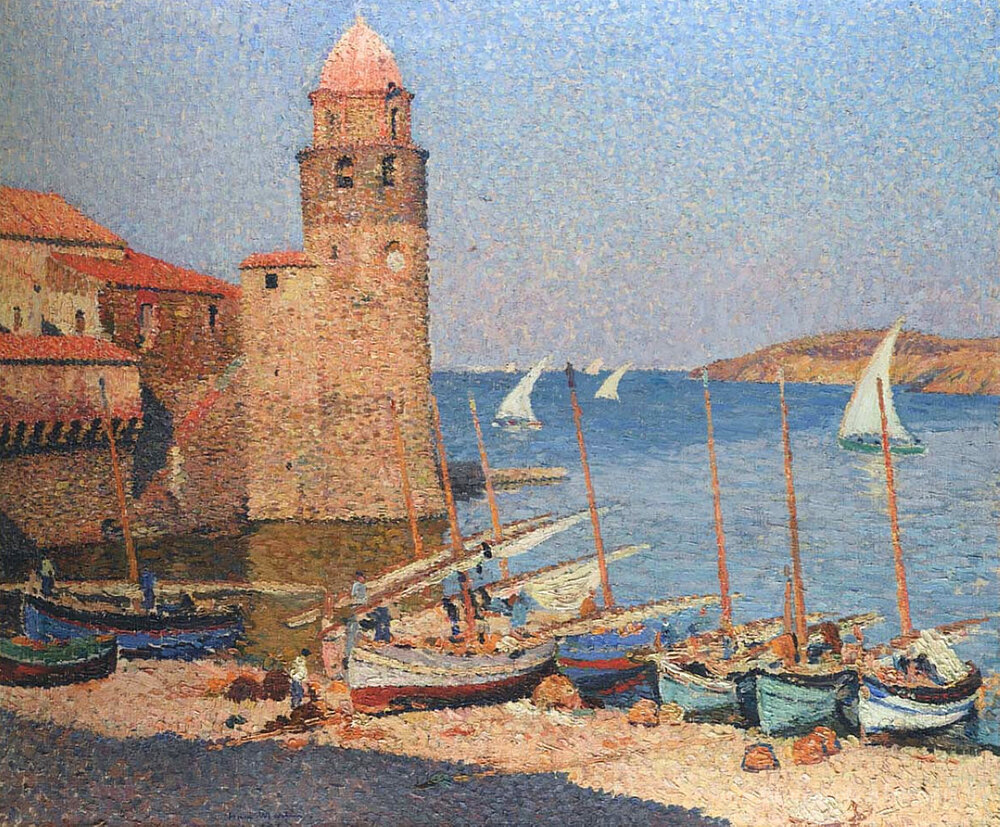 Nous vous proposons une reproduction artisanale sur toile du célèbre tableau 'Port Collioure' de Henri Martin, provenant du Musée de la Reproduction.