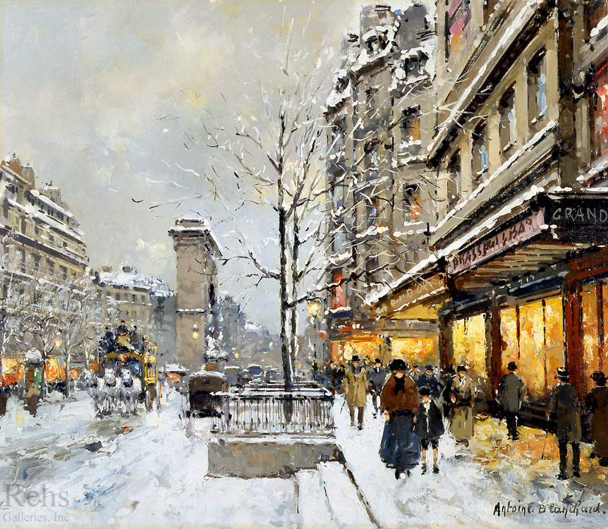 Nous vous proposons une reproduction artisanale sur toile du célèbre tableau 'Porte St. Denis, hiver' de Antoine Blanchard, provenant du Musée de la Reproduction.