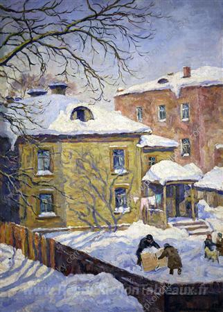 Nous vous proposons une reproduction artisanale sur toile du célèbre tableau 'Printemps. Cour.' de Pyotr Konchalovsky, provenant du Musée de la Reproduction.
