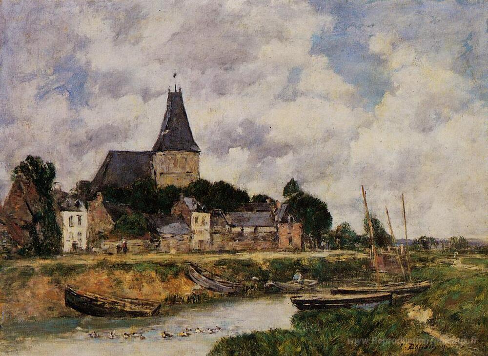Nous vous proposons une reproduction artisanale sur toile du célèbre tableau 'Quitteberbeuf' de Eugene Boudin, provenant du Musée de la Reproduction.