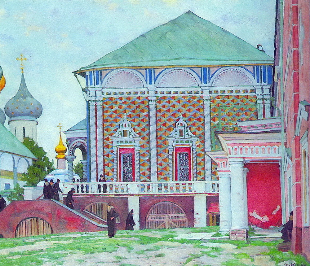 Nous vous proposons une reproduction artisanale sur toile du célèbre tableau 'Réfectory Trinity Sergius Lavra' de Konstantin Yuon, provenant du Musée de la Reproduction.