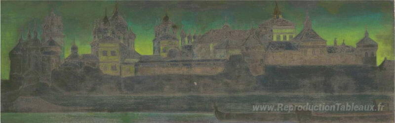 Nous vous proposons une reproduction artisanale sur toile du célèbre tableau 'Rostov Velikij. Cremlino.' de Nicholas Roerich, provenant du Musée de la Reproduction.