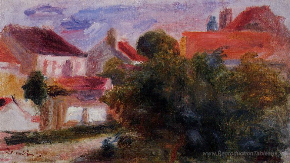 Nous vous proposons une reproduction artisanale sur toile du célèbre tableau 'Rue à Essoyes' de Pierre-Auguste Renoir, provenant du Musée de la Reproduction.