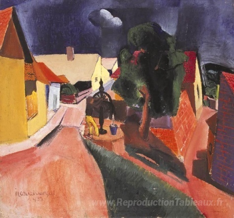 Nous vous proposons une reproduction artisanale sur toile du célèbre tableau 'Rue à Szentendre par temps orageux' de Istvan Ilosvai Varga, provenant du Musée de la Reproduction.