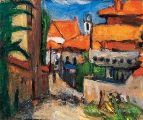 Nous vous proposons une reproduction artisanale sur toile du célèbre tableau 'Rue dans le sud de la France' de Bela Czobel, provenant du Musée de la Reproduction.