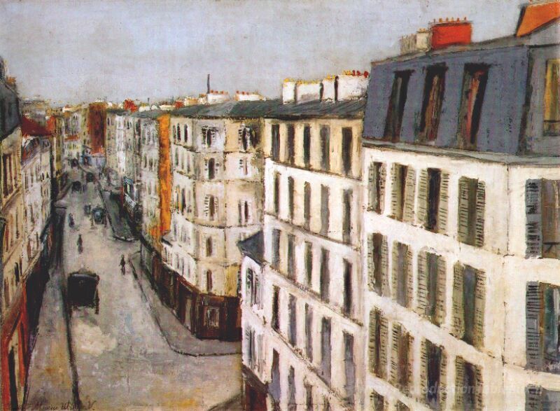 Nous vous proposons une reproduction artisanale sur toile du célèbre tableau 'Rue Jonquiiere' de Maurice Utrillo, provenant du Musée de la Reproduction.