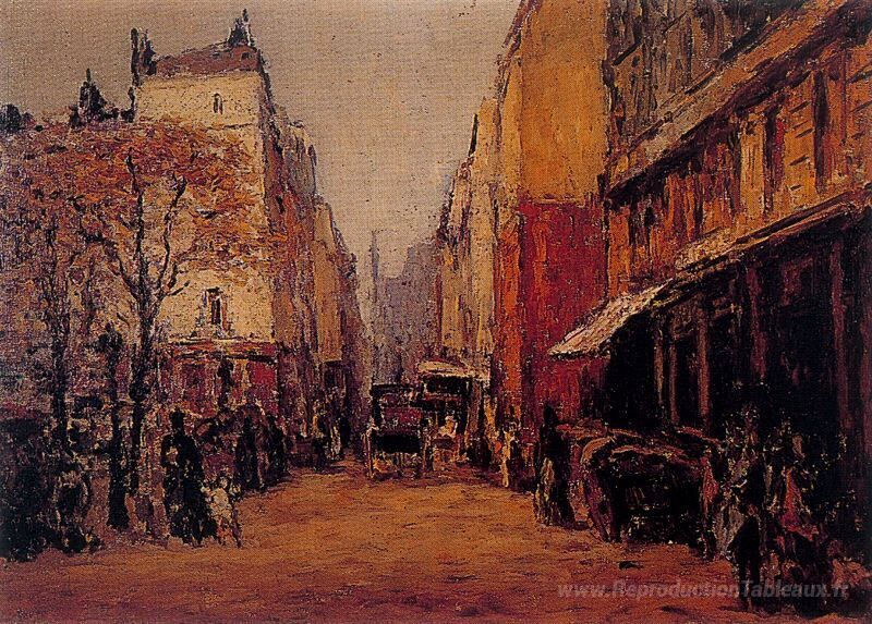 Nous vous proposons une reproduction artisanale sur toile du célèbre tableau 'Rue Moufetard (Parigi)' de Arturo Souto, provenant du Musée de la Reproduction.