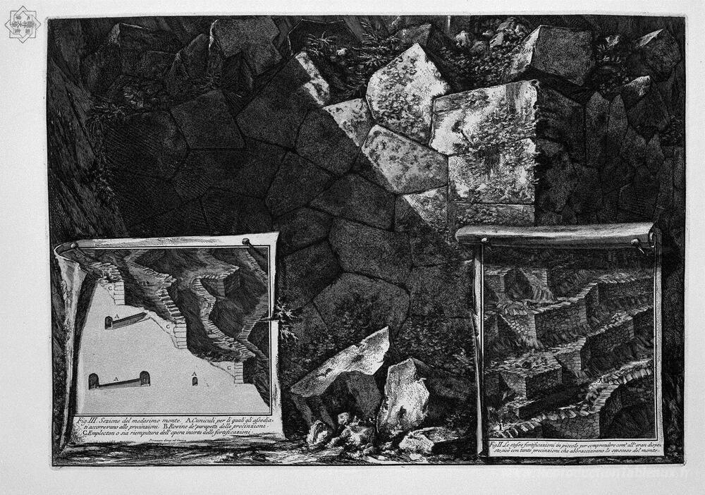 Nous vous proposons une reproduction artisanale sur toile du célèbre tableau 'Ruines des anciens fortifications de la montagne et de la ville ' de Giovanni Battista Piranesi, provenant du Musée de la Reproduction.