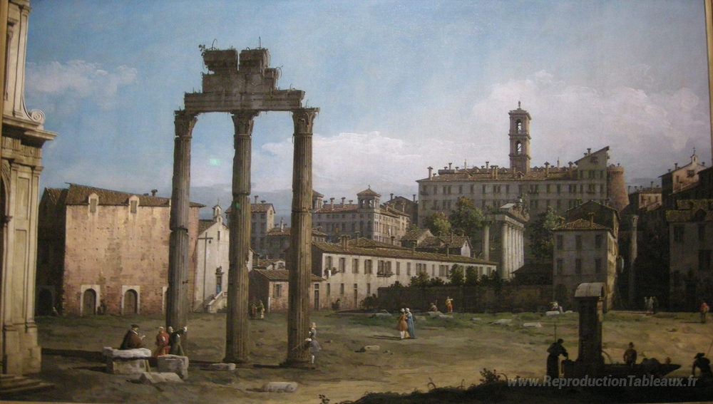 Nous vous proposons une reproduction artisanale sur toile du célèbre tableau 'Ruines du forum, Rome' de Bernardo Bellotto, provenant du Musée de la Reproduction.