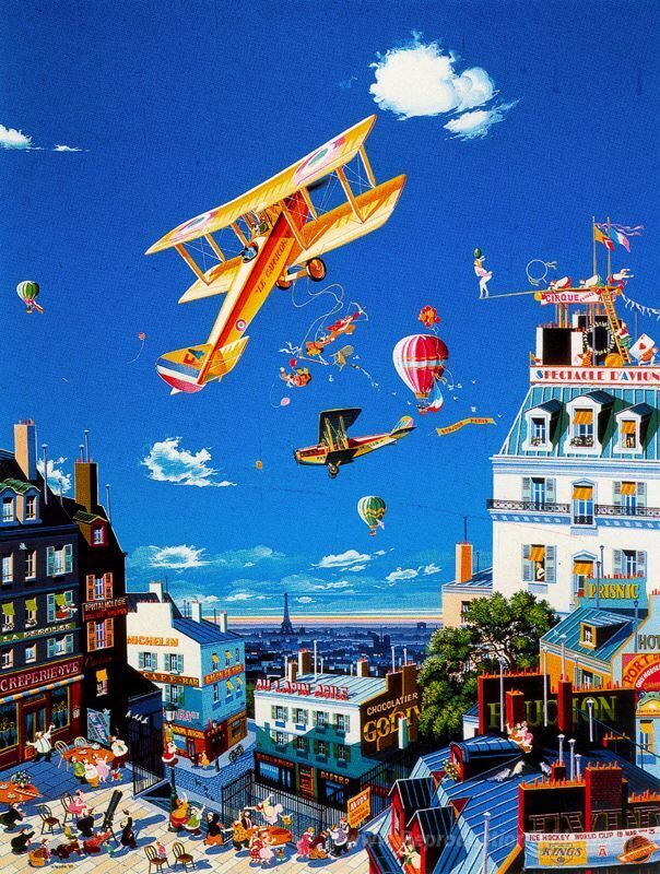 Nous vous proposons une reproduction artisanale sur toile du célèbre tableau 'Salon de l'aéronautique' de Hiro Yamagata, provenant du Musée de la Reproduction.