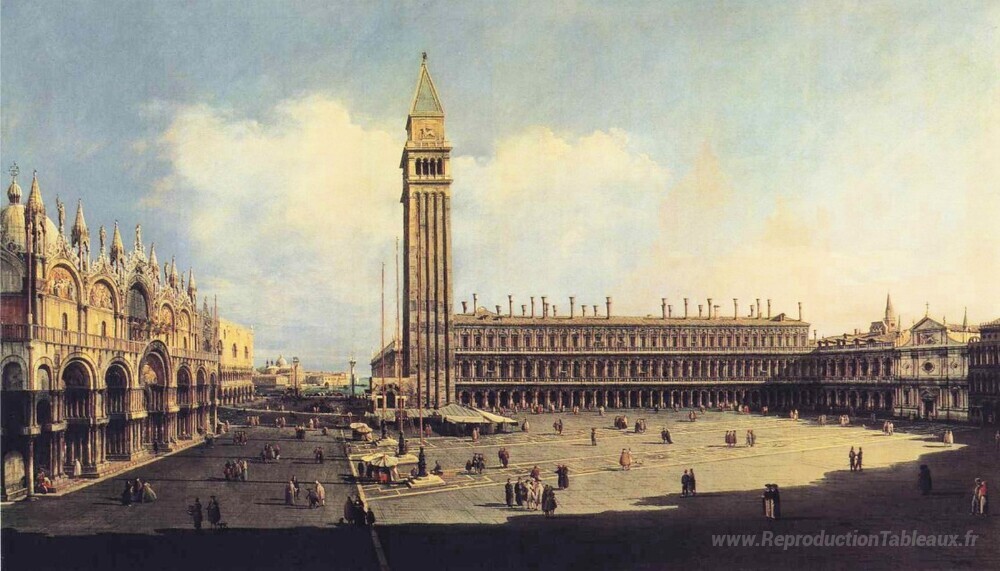 Nous vous proposons une reproduction artisanale sur toile du célèbre tableau 'San Marco Square de la tour de l'horloge face à la procure Nuove' de Bernardo Bellotto, provenant du Musée de la Reproduction.