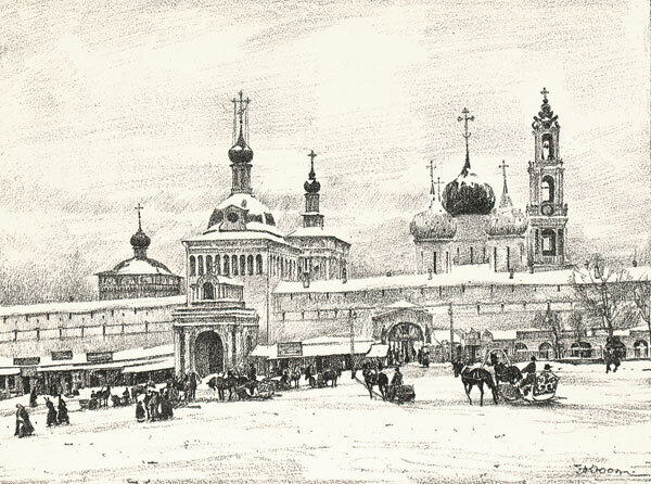 Nous vous proposons une reproduction artisanale sur toile du célèbre tableau 'Sergiyev Posad. Près des portes du monastère' de Konstantin Yuon, provenant du Musée de la Reproduction.