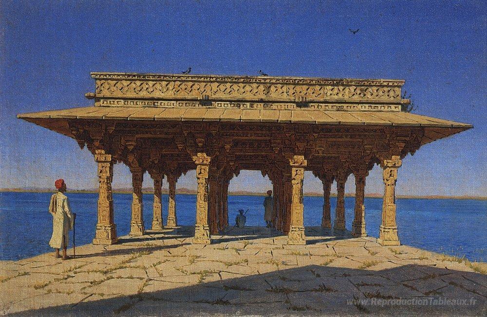 Nous vous proposons une reproduction artisanale sur toile du célèbre tableau 'Soirée sur le lac. L'un des pavillons de la promenade en marbre ' de Vasily Vereshchagin, provenant du Musée de la Reproduction.