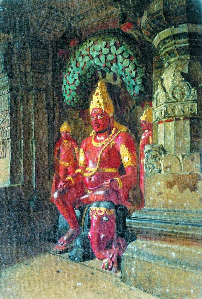 Nous vous proposons une reproduction artisanale sur toile du célèbre tableau 'Statue de Vishnu dans le temple d'Indra à Ellora' de Vasily Vereshchagin, provenant du Musée de la Reproduction.