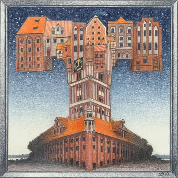Nous vous proposons une reproduction artisanale sur toile du célèbre tableau 'T 'comme Toruń' de Jacek Yerka, provenant du Musée de la Reproduction.