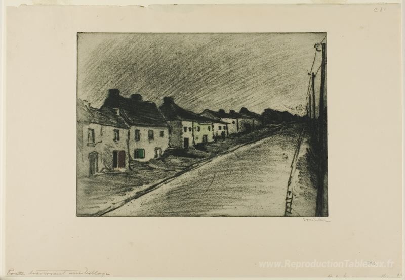Nous vous proposons une reproduction artisanale sur toile du célèbre tableau 'Village des Nations Unies par route' de Theophile Steinlen, provenant du Musée de la Reproduction.