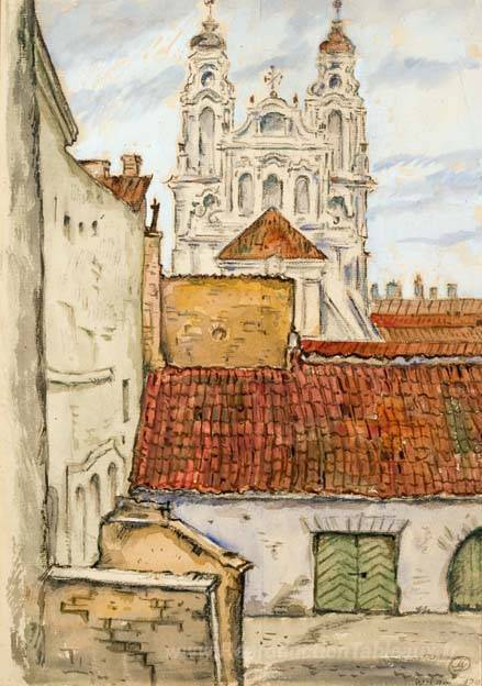Nous vous proposons une reproduction artisanale sur toile du célèbre tableau 'Vilnius. Église St. Catherine.' de Mstislav Dobuzhinsky, provenant du Musée de la Reproduction.