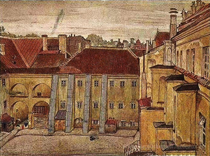 Nous vous proposons une reproduction artisanale sur toile du célèbre tableau 'Vilno. Dans la cour de l'ancienne université.' de Mstislav Dobuzhinsky, provenant du Musée de la Reproduction.