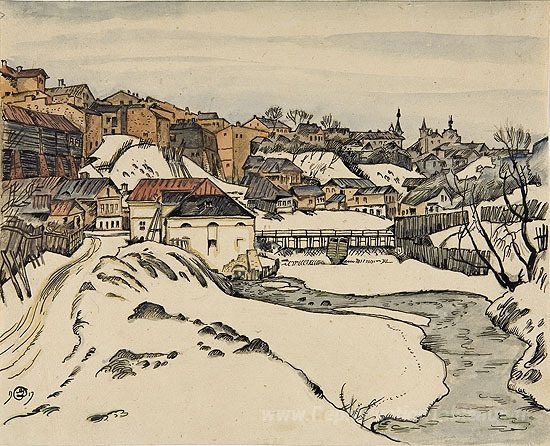 Nous vous proposons une reproduction artisanale sur toile du célèbre tableau 'Vitebsk' de Mstislav Dobuzhinsky, provenant du Musée de la Reproduction.