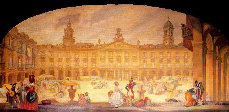 Nous vous proposons une reproduction artisanale sur toile du célèbre tableau 'Vitoria 1850' de Carlos Saenz de Tejada, provenant du Musée de la Reproduction.