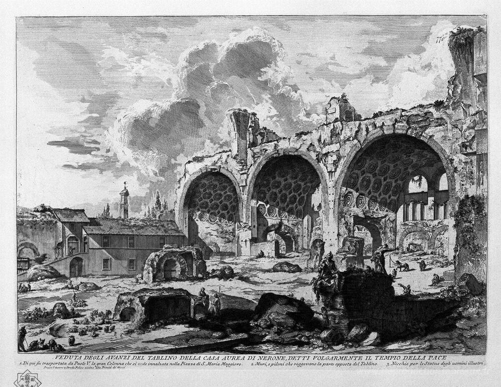 Nous vous proposons une reproduction artisanale sur toile du célèbre tableau 'Voir les restes de la maison d'or de Nero Tablino, vulgaire appe' de Giovanni Battista Piranesi, provenant du Musée de la Reproduction.