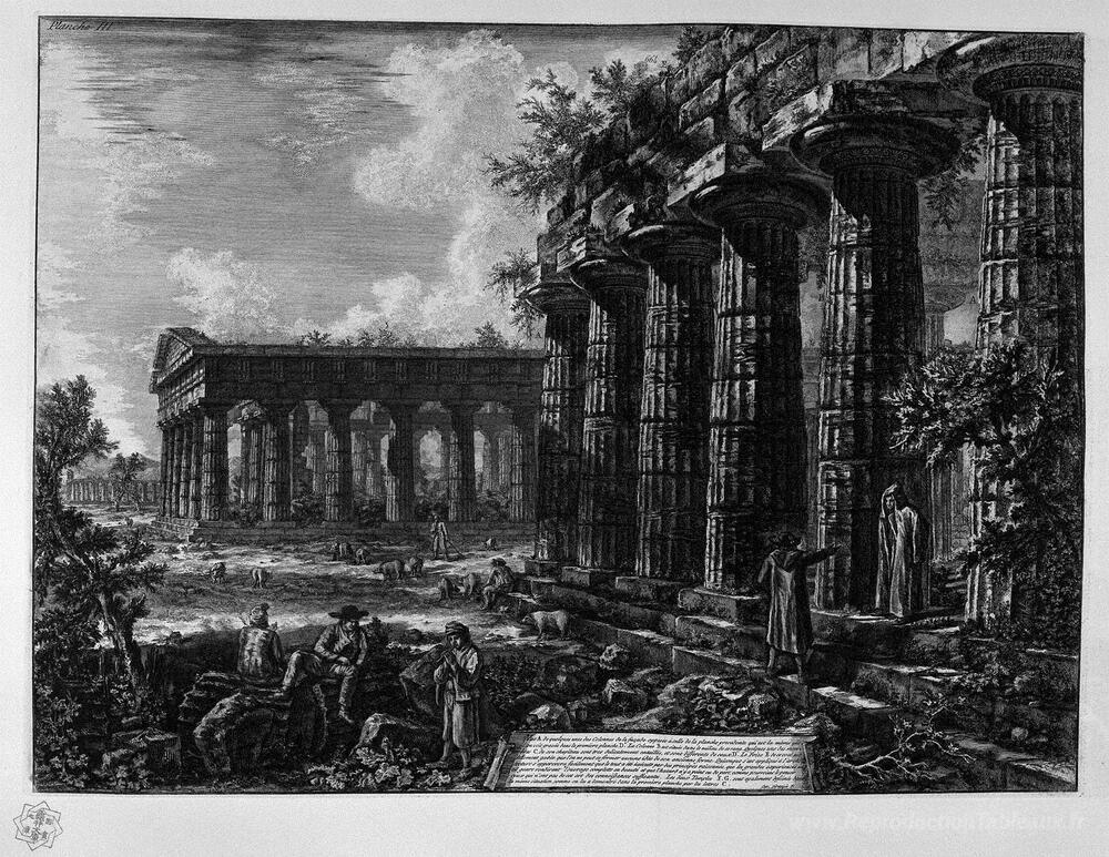 Nous vous proposons une reproduction artisanale sur toile du célèbre tableau 'Vue de certaines colonnes de la façade opposées à celle de la ta' de Giovanni Battista Piranesi, provenant du Musée de la Reproduction.