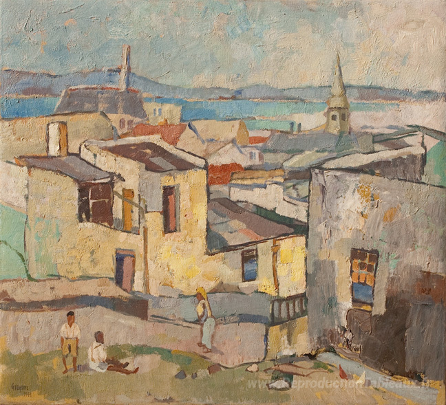 Nous vous proposons une reproduction artisanale sur toile du célèbre tableau 'Vue de la baie de table, bo-kaap' de Gregoire Boonzaier, provenant du Musée de la Reproduction.