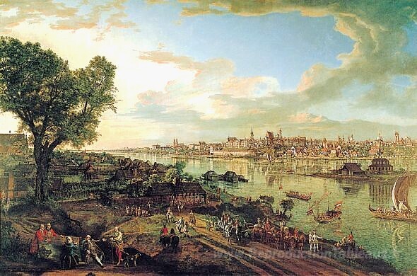 Nous vous proposons une reproduction artisanale sur toile du célèbre tableau 'Vue de Varsovie depuis Praga' de Bernardo Bellotto, provenant du Musée de la Reproduction.