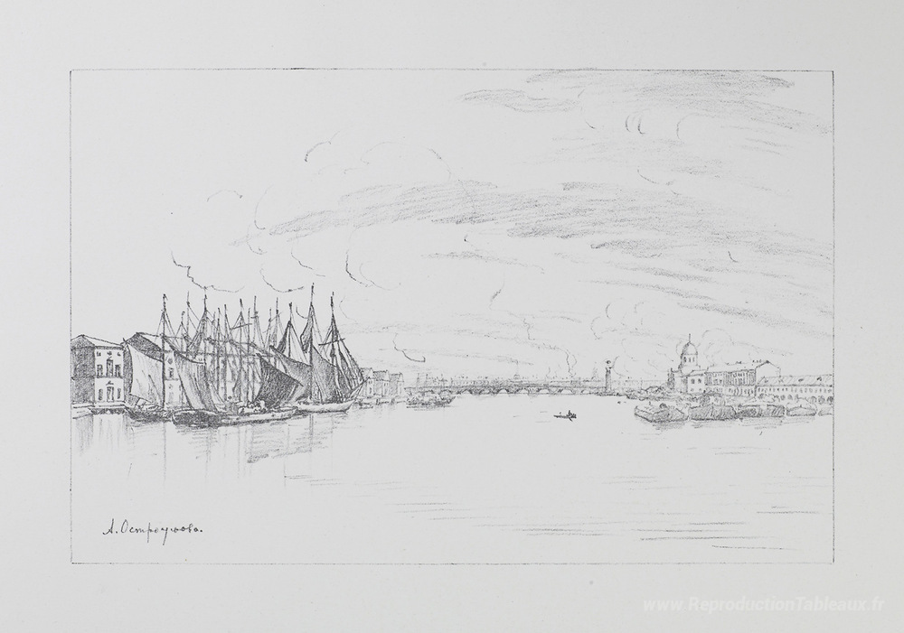 Nous vous proposons une reproduction artisanale sur toile du célèbre tableau 'Vue depuis le pont Tuchkov' de Anna Ostroumova-Lebedeva, provenant du Musée de la Reproduction.