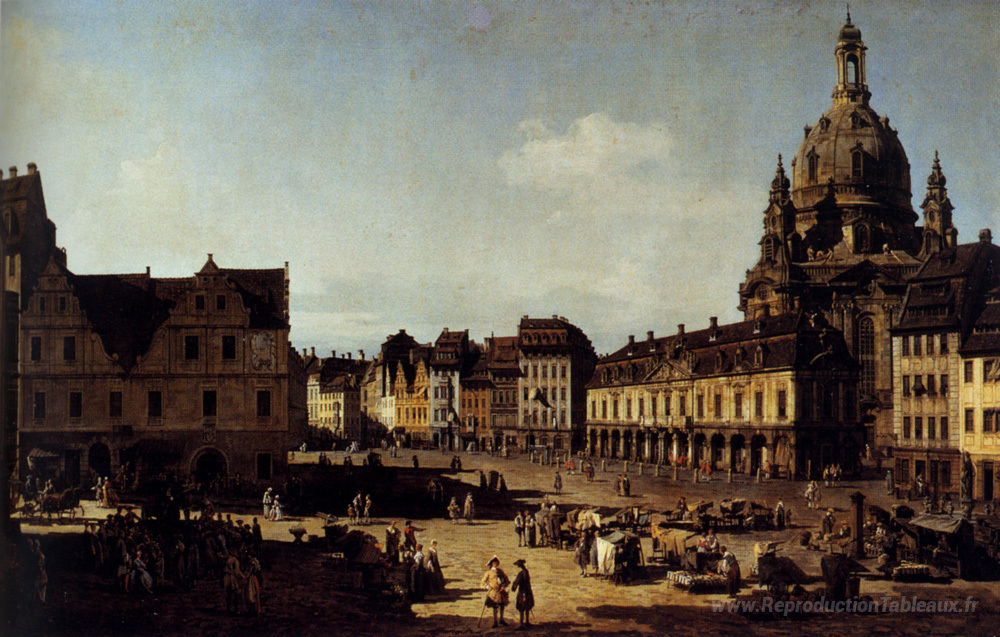 Nous vous proposons une reproduction artisanale sur toile du célèbre tableau 'Vue du nouveau marché à Dresde depuis la Moritzstrasse' de Bernardo Bellotto, provenant du Musée de la Reproduction.