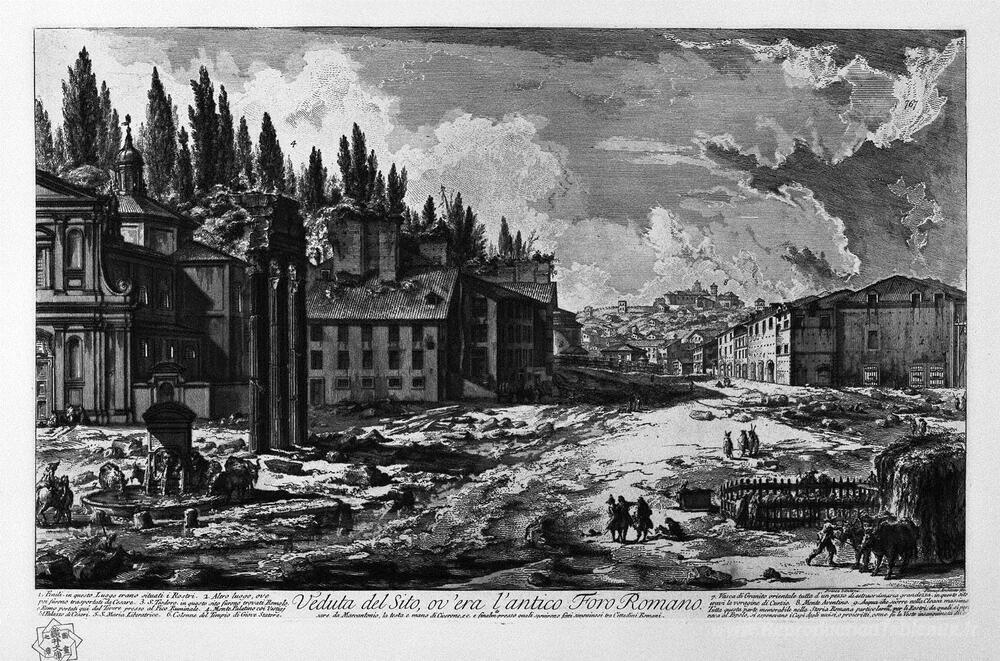 Nous vous proposons une reproduction artisanale sur toile du célèbre tableau 'Vue du site où était l'ancien forum romain' de Giovanni Battista Piranesi, provenant du Musée de la Reproduction.