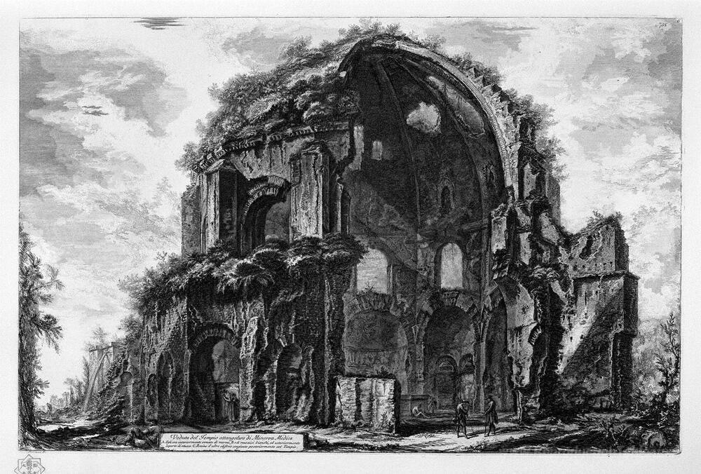 Nous vous proposons une reproduction artisanale sur toile du célèbre tableau 'Vue du temple de Minerva Medica' de Giovanni Battista Piranesi, provenant du Musée de la Reproduction.