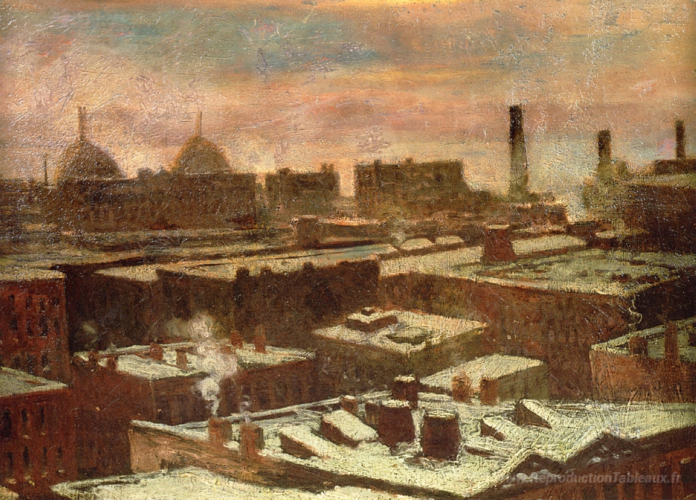 Nous vous proposons une reproduction artisanale sur toile du célèbre tableau 'Vue sur les toits de la ville en hiver' de Robert Julian Onderdonk, provenant du Musée de la Reproduction.