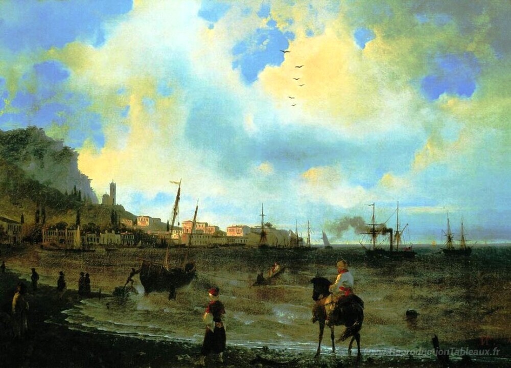 Nous vous proposons une reproduction artisanale sur toile du célèbre tableau 'Yalta' de Ivan Aivazovsky, provenant du Musée de la Reproduction.